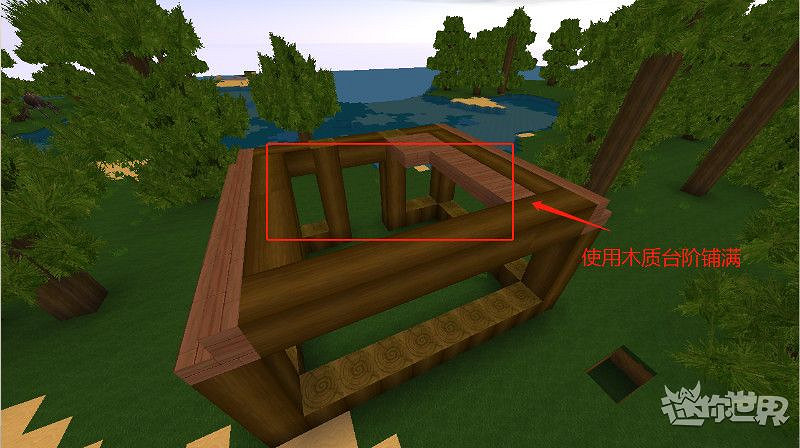 找到屋頂的中心位置,放置木質樓梯,做成一個小尖屋頂的形狀。