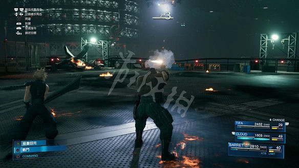 第一階段只有雷諾一個人,主控克勞德的話多利用勇猛模式的防反輸出。蒂法和巴雷特則多通過指令進行回復和技能的操控。雷諾的閃電炸彈範圍較大傷害也不低,看到他蓄力躍起時,注意及時走出範圍。他落地後有一定的起身時間,此時可以全力輸出。