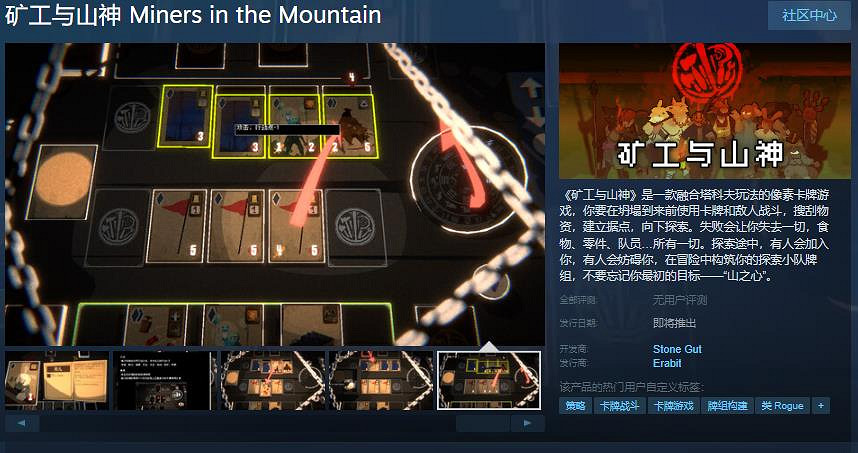 《礦工與山神》是一款融合塔科夫玩法的像素卡牌遊戲,你要在坍塌到來前使用卡牌和敵人戰鬥,搜刮物資,建立據點,向下探索。失敗會讓你失去一切,食物、零件、隊員…所有一切。探索途中,有人會加入你,有人會妨礙你,在冒險中構築你的探索小隊牌組,不要忘記你最初的目標——“山之心”。
