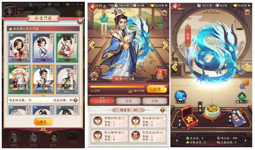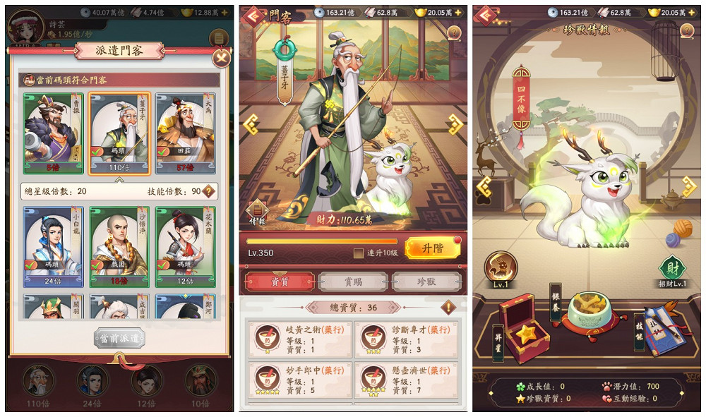 薑太公釣魚,願者上鉤,他是古代商朝末期的政治家、韜略家;也是經典神話角色裡的風雲人物,而在遊戲裡,薑子牙是有著36初始資質的高級門客,將其派遣至「碼頭」產業,賺錢速度加成可以高達110倍!另外還有專屬珍獸 -- 「四不像」可以增加財力。