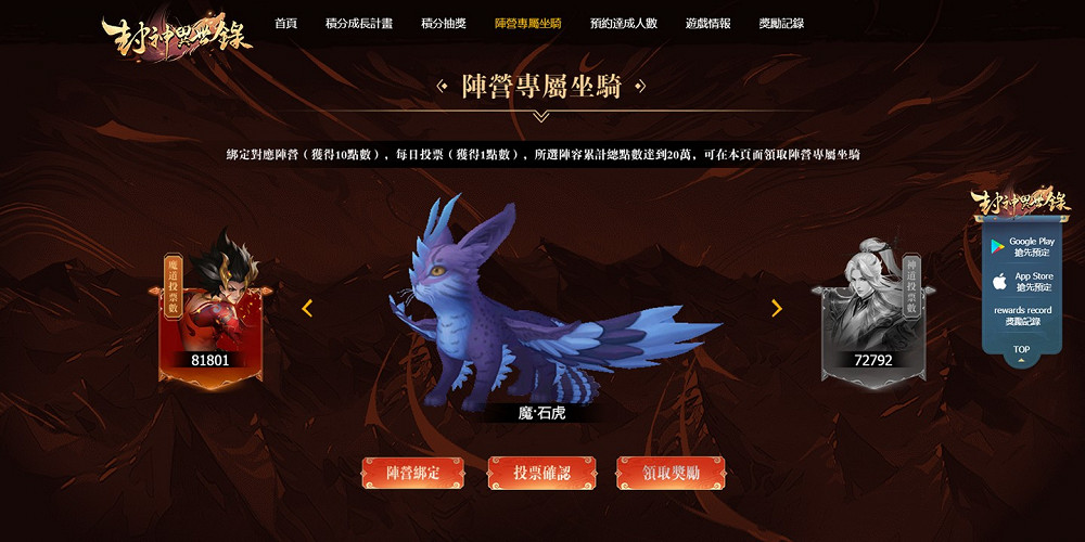 此外,選擇神魔陣營後可獲得專屬坐騎豪禮。只要成功綁定「魔道」陣營就可獲得「魔·石虎」的虛寶獎勵。成功綁定「神道」陣營,就可獲得「神·石虎」虛寶獎勵!