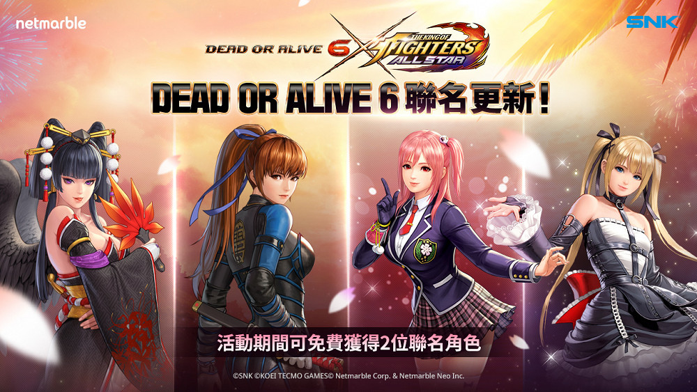《THE KING OF FIGHTERS ALLSTAR》世界中的衝突將一觸擊發,《Dead or Alive 6》裡受到眾多粉絲喜愛的英雄角色正式踏入《THE KING OF FIGHTERS ALLSTAR》的世界。粉絲和玩家現在可以收集包含霞、女天狗、瑪莉・蘿絲與穗香等四位全新格鬥家,並於 7 月 29 日至 8 月 19 日期間享受這次獨特的聯名活動。