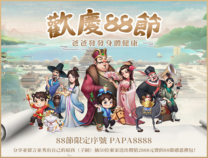 除了之前代言人、實況主們等等發送的禮包活動外,為了回饋各位大東家的支持,本週不僅特別加碼「奧運加油」以及「粉絲團集讚」等好康活動,還準備了「歡慶88節」活動,讓大東家們在88節對爸爸表達感恩的時候,也能在遊戲中“發!發!發!”,活動詳情可以關注《歡樂大東家》官方粉絲團來了解,都跟你說了~不要錯過囉!