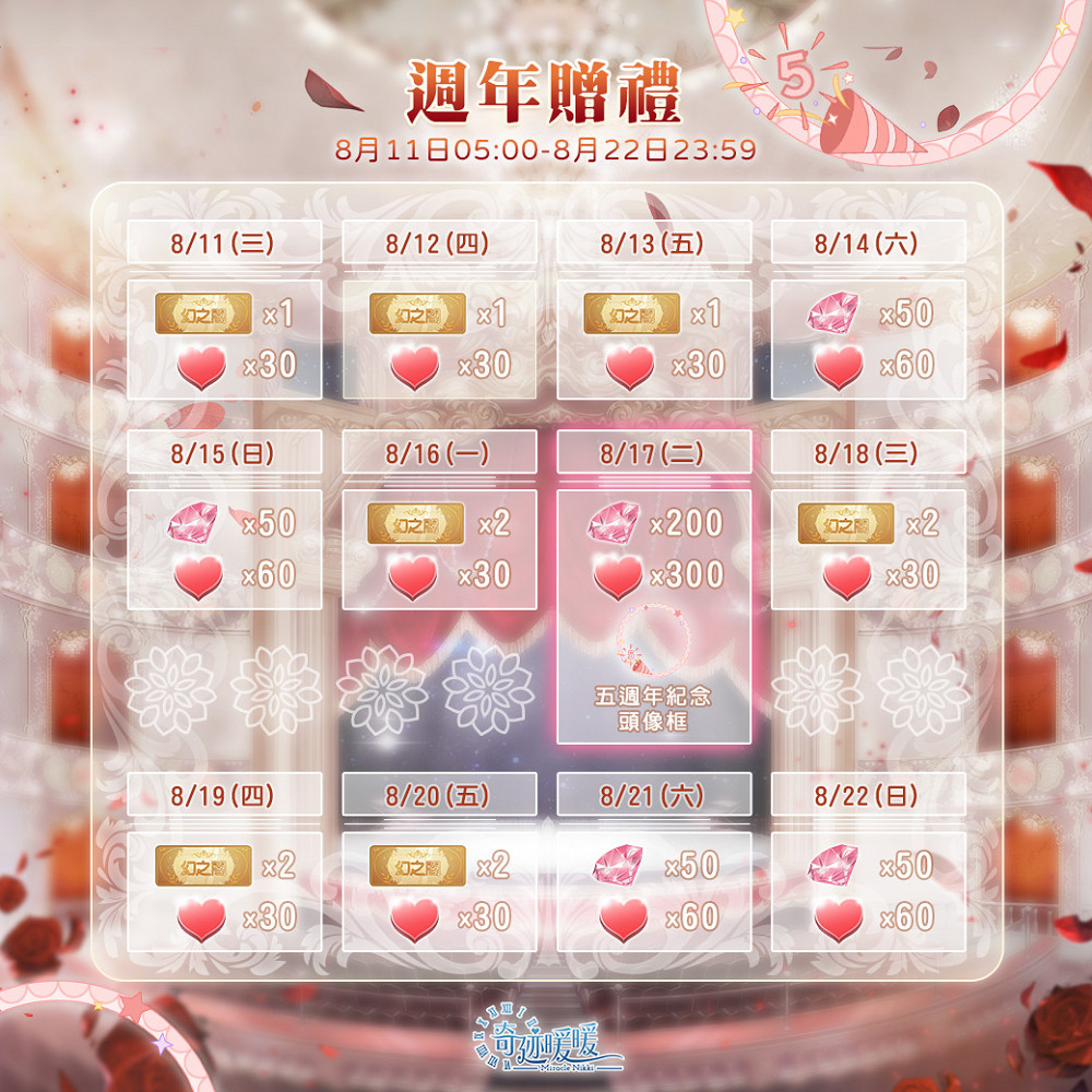 五週年贈禮活動將於11日上午5點至22日登場,在活動期間內,搭配師每日登入遊戲可前往活動介面領取幻閣券、體力和鑽石等五週年贈禮。8月17日五週年當日還可領取鑽石x200、體力x300和五週年紀念頭像框。