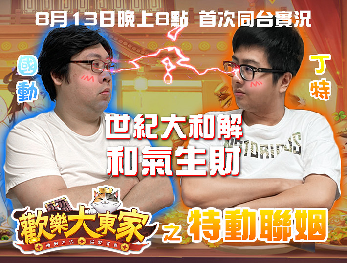 另外兩大遊戲實況主丁特與國動也將在本週8/13(五)晚間20:00聯合實況,深入體驗《歡樂大東家》內更多有趣的內容,這也是兩人多年來第一次正式同台實況,大家可以一起來觀賞這場精采的世紀大和解。立刻來下載遊戲並關注粉絲團,一起來圍觀這檔好戲吧!