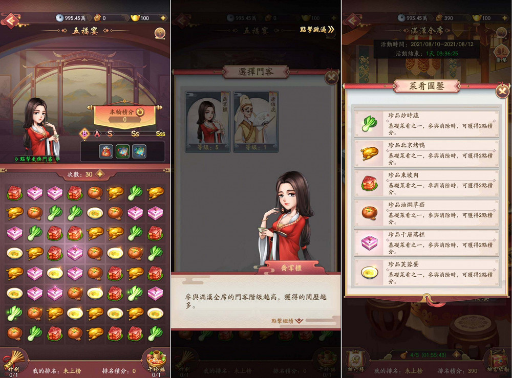 東家可以消耗體力來派遣門客參與滿漢全席,以益智消除的方式在宴席中消除菜餚獲得積分,根據獲得的積分數,會得到不同的宴席評價,從高到低依次為SSS、SS、S、A、B,評價越高獲得的閱歷越多,獎勵道具也越豐厚!