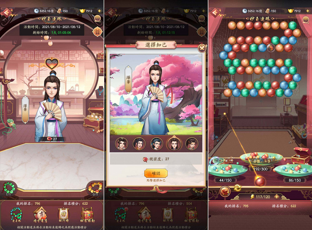 東家們在經商之路上定會結識各式各樣的人,也許還會有能作為知己的心腹之交,在珠玉舫能給喜歡的角色做手串當禮物,還有機會獲得回禮!製作手串要藉由撞擊2個以及以上相同顏色的玉珠,來促使玉珠落入玉盤,並獲得活動排行積分。