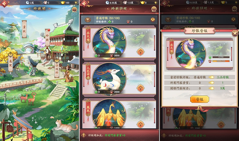 珍獸的初始評級皆為「普通珍獸」,當潛力值與成長值達到晉級條件,就可以提升珍獸評價等級,對門客的加成幅度也會上升,提供玩家一個全新的門客成長途徑。