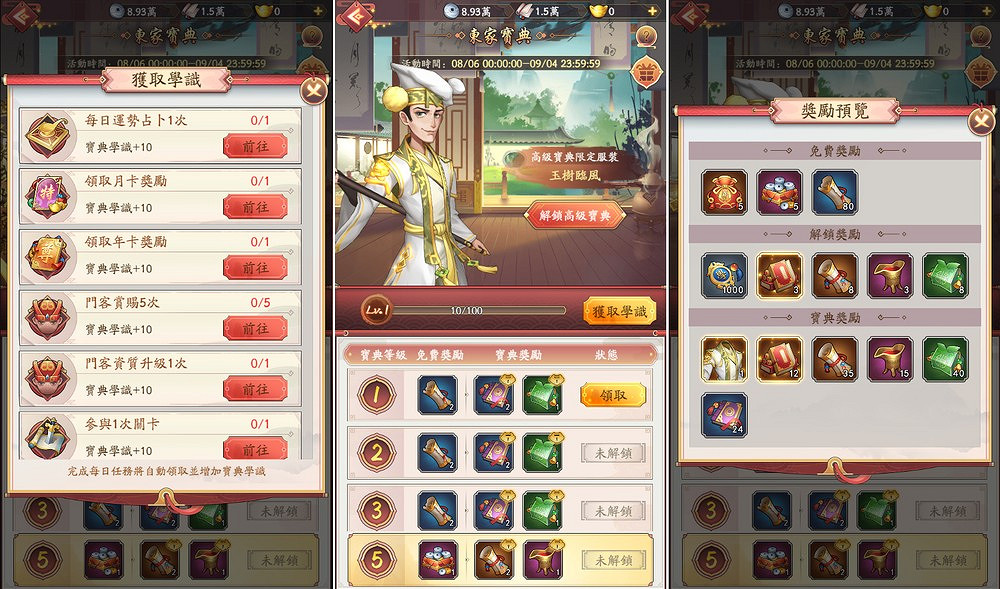 限時活動「東家寶典」即將展開,玩家將可以透過完成每日寶典任務來獲得寶典學識,累積學識可以提升寶典等級,每次提升等級都可以獲得獎勵,只要每天定時完成任務就能逐漸累積學識,將寶典等級提升越高獎勵也越豐富;另外要是購買寶典,在活動期間內還能額外獲得寶典獎勵,對每天都上線的玩家而言是很划算的選擇喔!