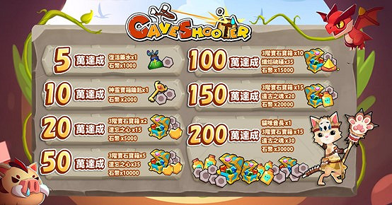 ● 200萬達成:貓咪酋長 x1、3級寶石禮包 x15、遠古之魂 x30、石幣 x30000