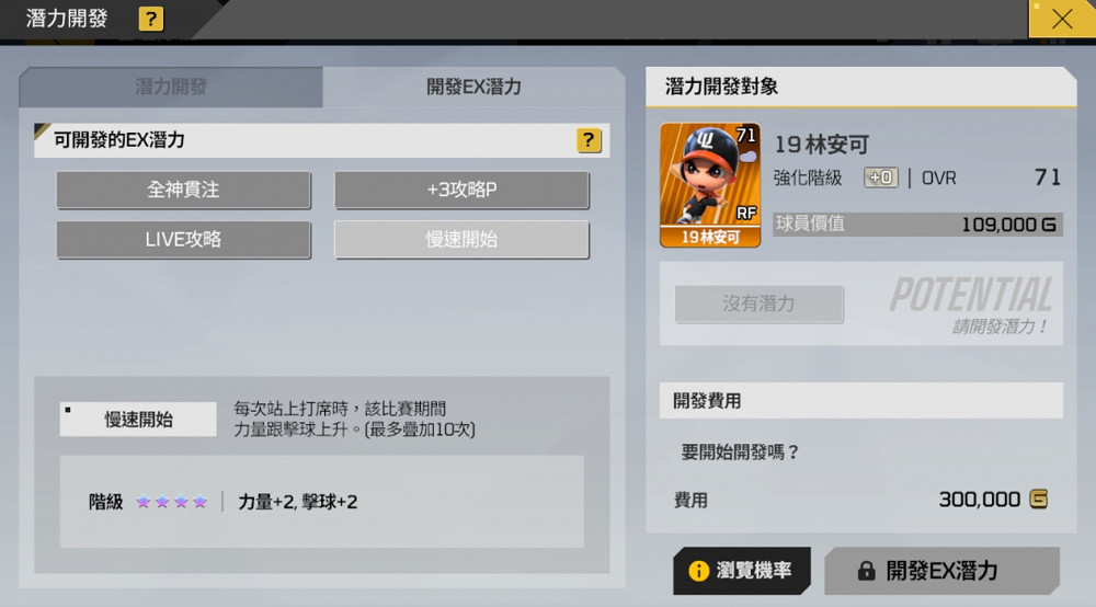 本次更新新增開發「EX潛力」的功能。「EX潛力」為一般潛力追加的能力,所有階級的打者與投手均可獲得,當球員的一般潛力到達完美品質時,便可以對其進行開發EX潛力,玩家開啟後可得到新條件觸發潛力或額外的附加能力。