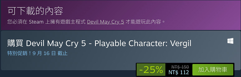 同時 “可玩角色-維吉爾” DLC也在打折 -25%,售價為新台幣 112 元。