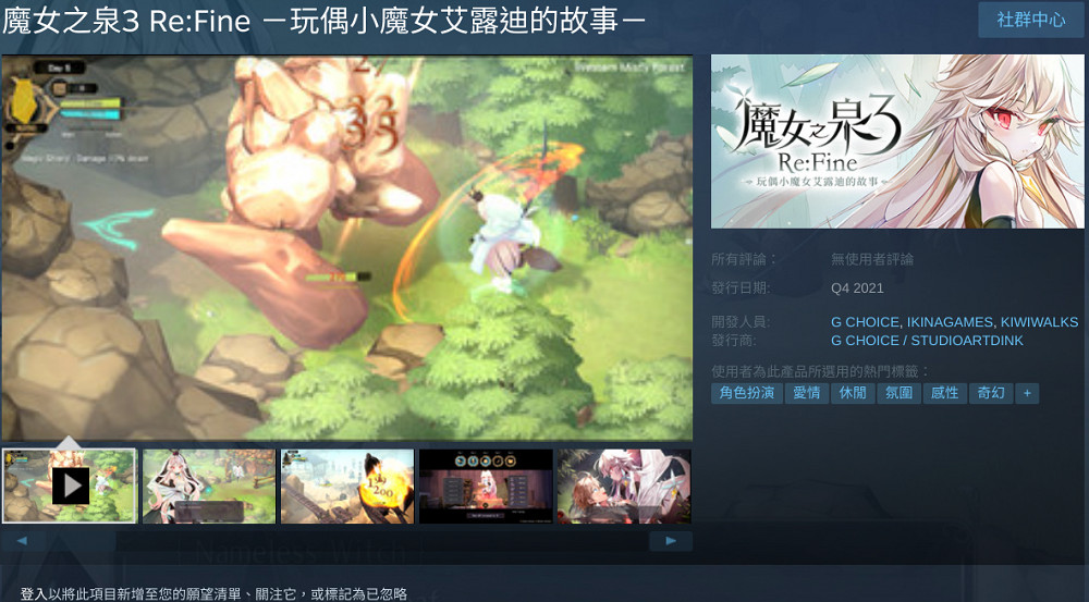 發行商G CHOICE和開發商IKINAGAMES、Kiwi Walks將於2021年第四季度在Steam上發售《魔女之泉3 Re:Fine-玩偶小魔女艾露迪的故事-》。在此之前該作一直為Switch獨佔,它於2020年12月在Switch上發售。目前本作的Steam頁面已上線,售價暫未公布,頁面顯示支援中文。