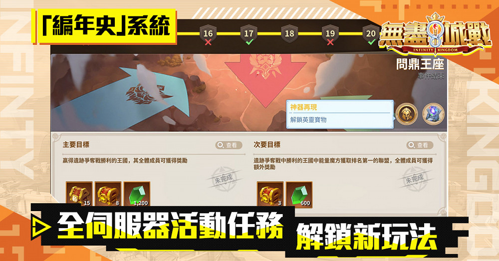 「編年史」系統在領主等級到達10級時就可開啟,一共分為21個階段,每個階段的活動任務都有主要目標和次要目標,完成目標就可獲得豐富的寶箱及寶石獎勵;主要目標是階段任務開啟後,由全伺服器所有領主齊心完成的,完成後便可開啟新玩法或是解鎖建造採集增益Buff,例如重要的「遺跡爭奪戰」便是需要在14階段完成後才能開啟,完成21階段可解鎖「英靈寶物」等,領主們一同來為王國的榮譽盡一份心力吧!