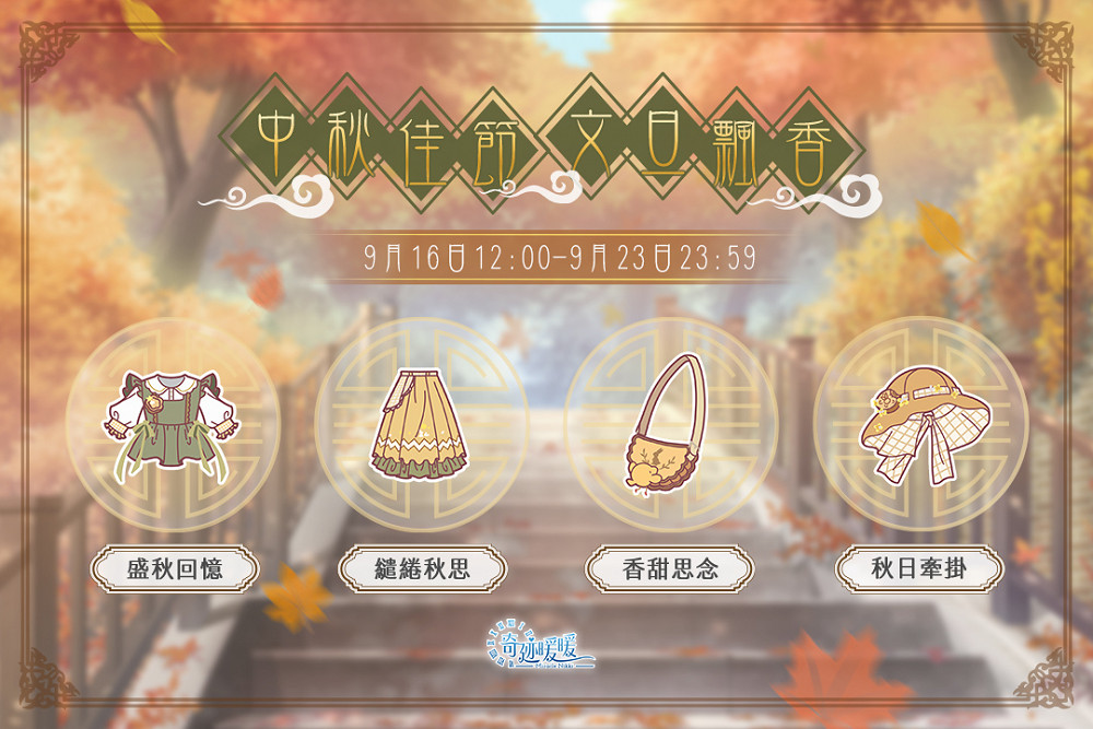 因應中秋佳節到來,即日起至23日止,搭配師可前往《奇迹暖暖》官方粉絲專頁,在「中秋佳節.文旦飄香獎勵活動」貼文(https://nmn.tw/NU3Moon)下方標記一位好友,並寫下圖中最喜歡的配件名稱,當留言數達指定目標,便可獲得中秋主題散件「盛秋回憶」、「繾綣秋思」、「香甜思念」以及「秋日牽掛」各1個。