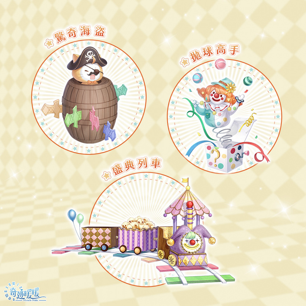 當搭配師首次獲得限定部件時,可額外得到一個「華麗彩球」;而獲得重複部件時,重複部件將轉化為一定數量的「點點領結」,使用「華麗彩球」與「點點領結」可在獎勵中兌換3款嘉年華主題配件「驚奇海盜」、「拋球高手」與「盛典列車」。