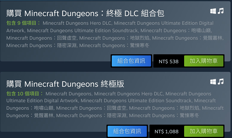 《當個創世神麥塊:地下城》標準版售價新台幣538元;《當個創世神麥塊:地下城》終極DLC捆綁包售價新台幣538元,包含6個付費DLC,不含主體;《當個創世神麥塊:地下城》終極版售價新台幣1088元,包含遊戲主體,6個付費DLC以及原聲帶和數字藝術作品。