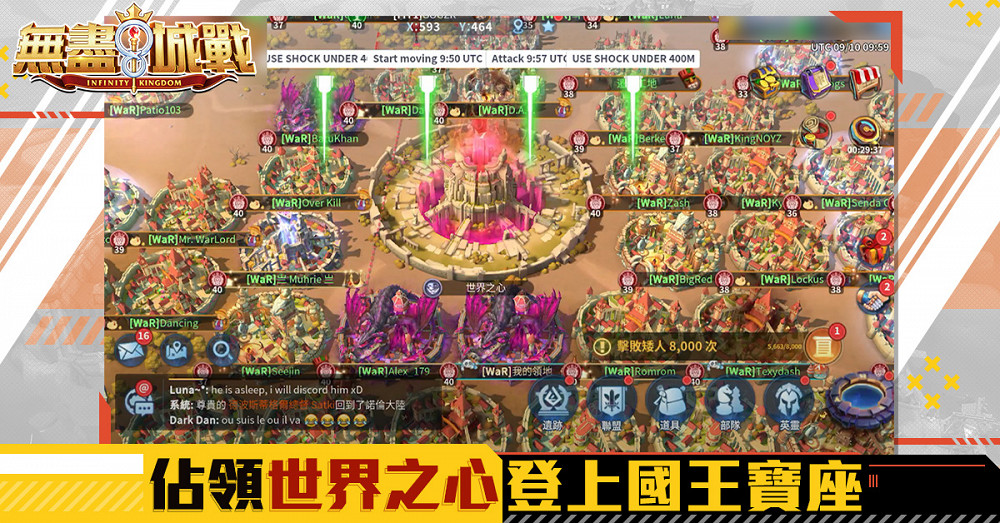 《無盡城戰》於9/23 上午11:00正式上線,領主們除了可以生產資源、建造城堡、野外打BOSS,培養英靈及寵物龍外,還可挑戰個人玩法「時光之井」及聯盟玩法「幻境戰場」和「遺跡爭奪戰」等;而全球領主最期盼的則是攻打「世界之心」取得到國王寶座,站上權力之巔,屆時還可獲得優渥的神祕寶藏。