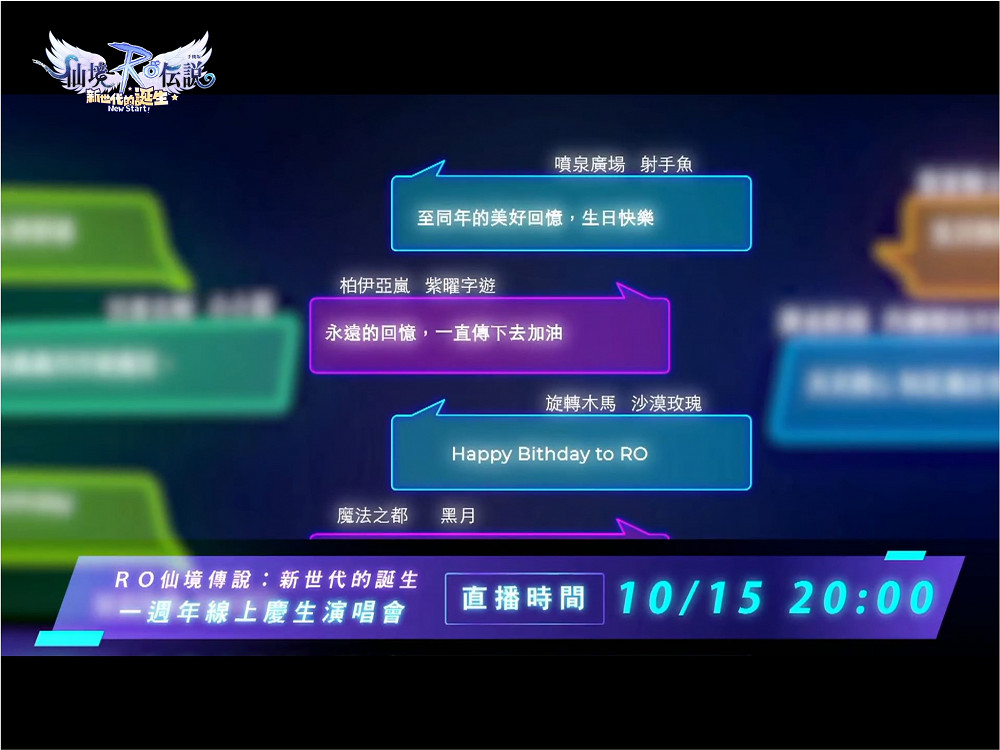 許多玩家在活動開始前紛紛湧入遊戲中發表週年的感言,玩家們這一年經歷的冒險心得想法以及未來展望都在遊戲畫面上輪番播放,充滿了對遊戲的心意,更讓人驚喜的是,還有多位嘉賓為遊戲錄製了祝福影片,包括Gravity的COO北村先生、Gravity的CEOPark先生 、作曲家ESTI,甚至連很久沒現身的RO漫畫原作者李命進先生都特別為遊戲送來週年祝福,即使不在現場祝福的心意也都相同。
