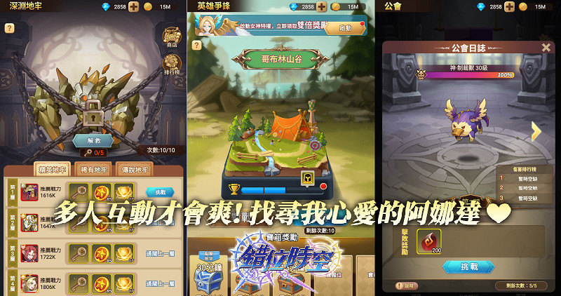 眾多放置遊戲裡,玩家們最害怕遊戲玩到最後,只有自己在玩!?因此我們設置了許多多人任務,讓眾多玩家們,可以一同挑戰任務副本,讓喜愛與人互動的您,也能在遊戲中,找到志同道合的好友,並在未來生活上,可以互揪一起出去玩,甚至找到心愛的另一半。