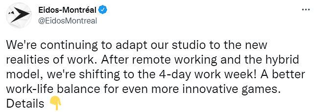 在一篇詳細介紹這些變化的問答部落格中,Eidos蒙特利爾工作室表示,這個想法“不是要把工作時間壓縮成四天,而是要回顧我們做事的方式和投入的優質時間,目的是更好地工作”。
