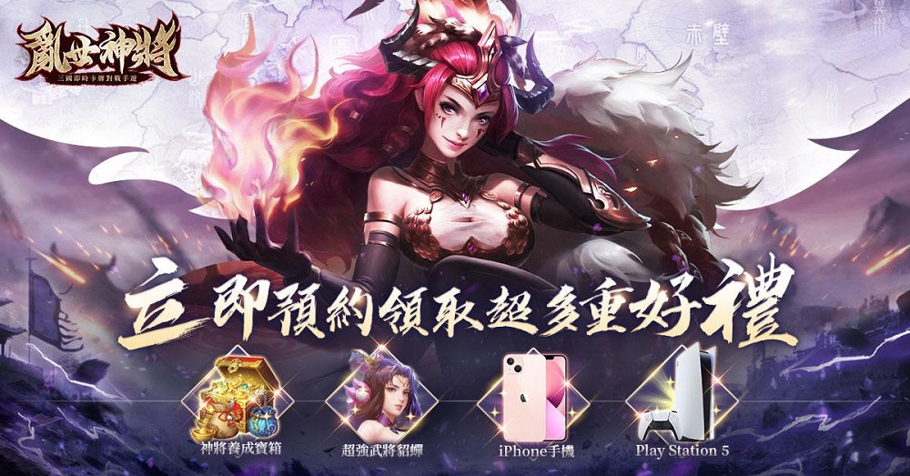 《亂世神將》於近日開放台港澳事前登錄活動,超多限定好康大放送。玩家進行預約,即可獲得超強三國武將「貂蟬」。參與雙商店預訂,加碼送「神將招募令10連抽」!在活動頁面參與「神將搶先招募」的活動或者是邀請好友等方式,均有機會獲得iPhone13、PS5等豪華好禮!