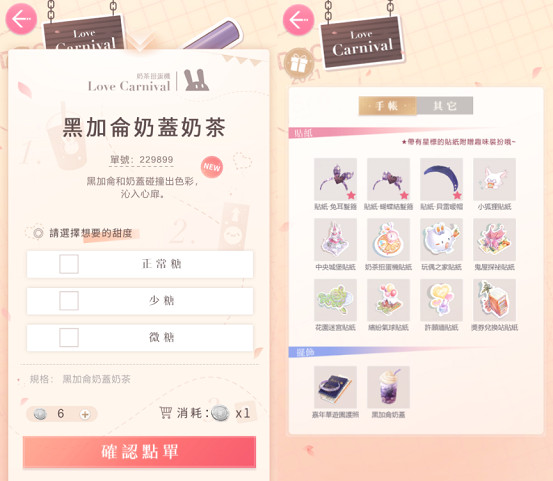 在嘉年華地圖上的遊樂景點「奶茶扭蛋機」中,玩家可使用「點單幣」選擇甜度下單「他」的專屬飲品,即有機會獲得三週年手帳貼紙、手帳擺飾、角色限定裝扮與貼紙及遊戲道具等獎勵。而每日參與並完成所有的小遊戲挑戰,便可免費集齊5位角色的全部扭蛋獎勵。