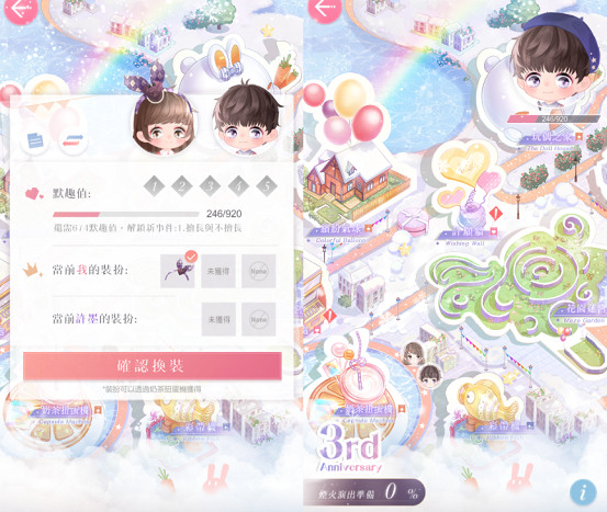 此外,點擊嘉年華介面右上角Q版頭貼處,可以查看與「他」的默趣值和目前裝扮。當玩家為自己和「他」換上由扭蛋獲得的裝扮後,該圖像會出現在小遊戲和地圖上;且當默趣值達指定階段,即可閱讀和「他」的三週年特別遊園劇情。