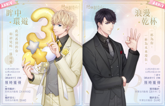 為了歡慶三週年,《戀與製作人》推出限時「紀念徽章」獎勵活動,即日起至12月14日止,當玩家完成每日指定任務,或達成指定累計登入天數、羈絆數量與主線章節進度等,即可領取「紀念徽章」獎勵。