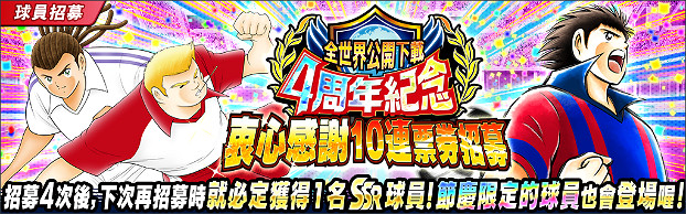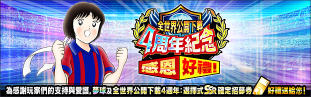 登入遊戲首日可獲得「夢球」、「【SSR】里鮑爾(加泰隆尼亞)」、「全世界公開下載4週年紀念衷心感謝10連招募券」之外,第2日以後將贈送「全世界公開下載4週年紀念大感謝10連招募券」,以及強化球員時必要的各種道具!