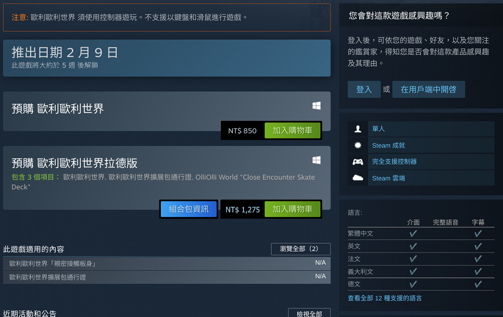 滑板遊戲《歐利歐利世界 (OlliOlli World)》現已在Steam開啟了預購,售價新台幣850元,遊戲於2022年2月9日台灣時間早上7:00點發售,支援中文。注意該作不支援鍵盤操作,需要使用搖桿。