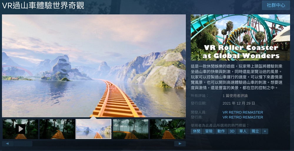 VR冒險遊戲《VR雲霄飛車體驗世界奇觀》現已在Steam發售,支援HTC Vive。目前發售特惠,原價約新台幣65元,現只需9元,遊戲自帶中文。