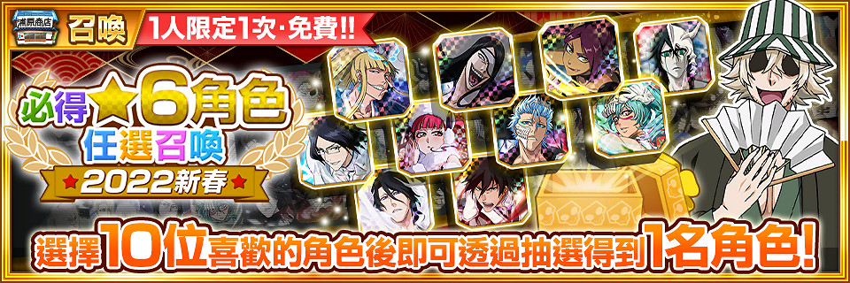 「2022新春必得★6角色任選召喚」開放期間,每人可免費進行1次召喚。