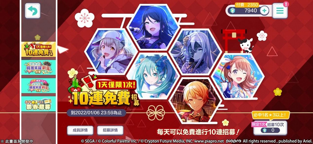 「世界」送上新年禮物!於2022/1/1至2022/1/6期間,每天都有一次免費十連招募!快趁活動期間登入,招募你心儀的成員吧。本次免費招募有機會獲得4星成員和演出服裝!趁著新年招募新的成員,編組你的團體、增加綜合力,為你每一次打歌助威吧!