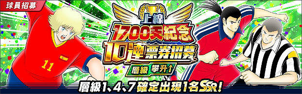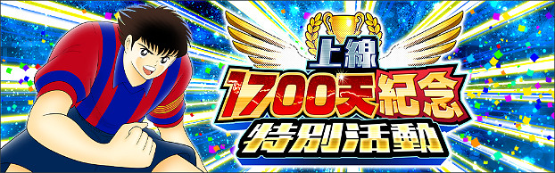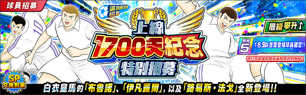 舉辦可利用「上線1700天紀念 10連招募券」作10次招募的活動!招募將是以層級攀升的形式進行,在 step 1、4和 step 7可確定獲得1名SSR球員!