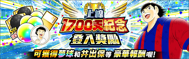 活動期間登入,除了可獲得夢球、「上線1700天紀念 10連招募券」及「上線1700天紀念 夢幻彩星缽招募券」外,更可獲得「井出 保」等豪華報酬! 不同的登陸日會對應贈送不同的道具,請務必登入遊戲獲得獎勵喔!