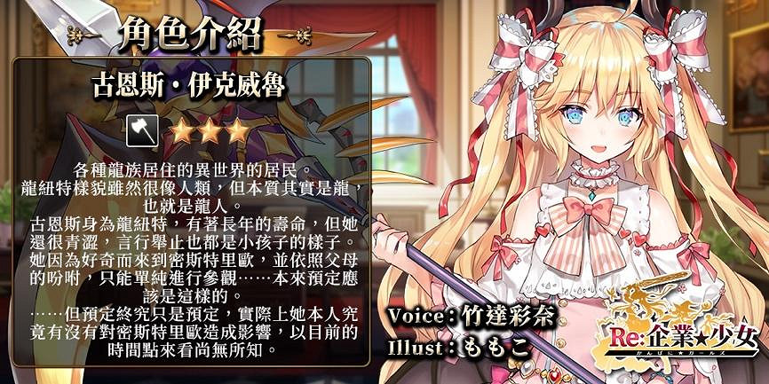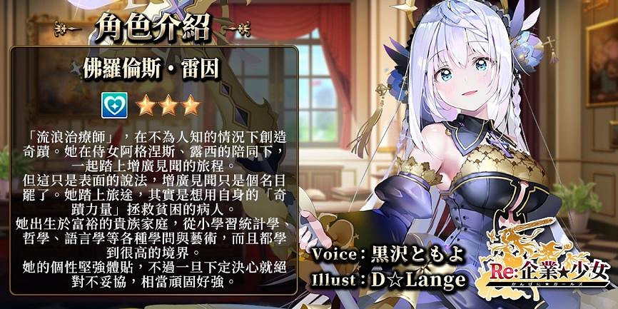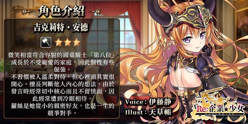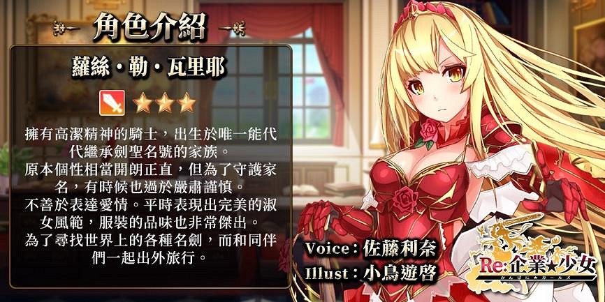 受到廣大日本玩家喜愛的免費網頁RPG遊戲《企業★少女》(日語:かんぱに☆ガールズ),特別為台灣&繁中版玩家在地化打造的更名為《Re:企業★少女》於日系遊戲平台「Johren」正式上市囉!除了許多操作介面特別設計成「繁體中文版本專屬」,不只玩起來順手,連劇情都特別好懂!身為玩家的你將在劍與魔法的世界中,跟各種可愛的女孩相遇成為企業夥伴,該怎麼經營公司、招募優秀員工並且加以培育,就是你的任務啦~【快到文末連結前往遊玩!】