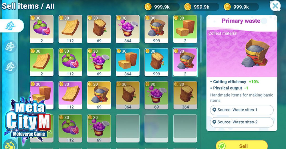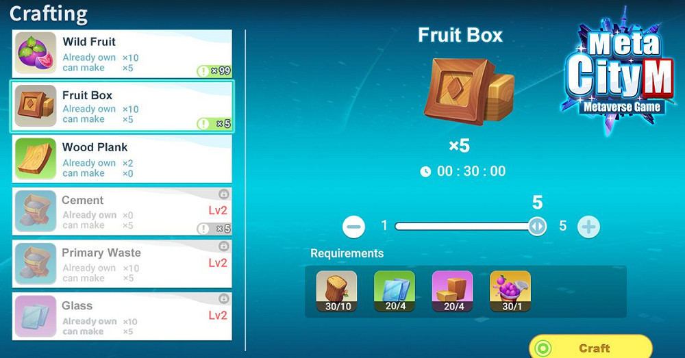 在《MetaCity M》是沒有「角色等級」的,超過15種生活技能,會是影響玩家角色發展的核心內容,可透過各種採集及製作行為來鍛鍊提升等級,如伐木、採礦、種植、狩獵、捕魚、烹飪、熔煉、零件加工、紡織...等,都會需要使用不同的工具。所有的原始材料、加工半成品、製作完成物,除了通通都可以在遊戲內進行玩家之間交易買賣之外,也是「房產建築」「傢俱」「交通工具」「職業製造」「公眾建造發展」的核心系統需求資源。