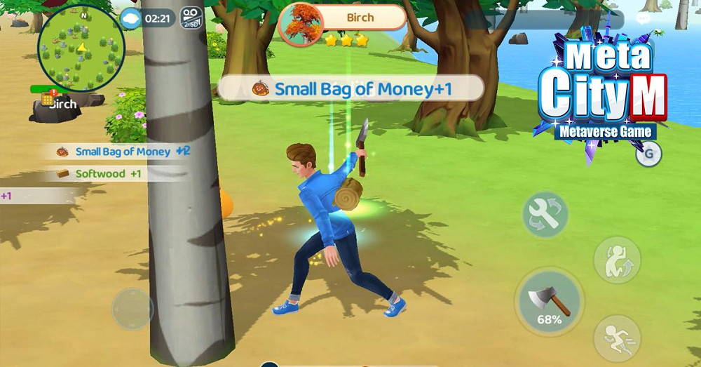 (《MetaCity M》透過伐木來獲得原木材料 )