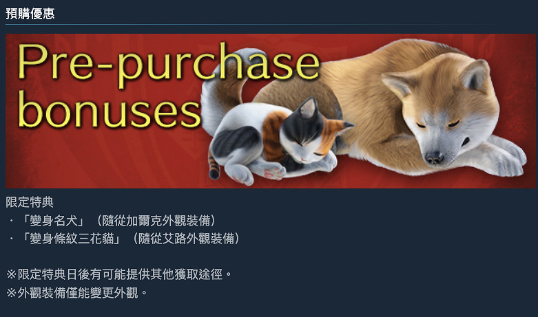 卡普空《魔物獵人:崛起》大型資料片“曙光”今日已在Steam開啟預購,標準版售價約新台幣1052元,豪華版預購可享7%折扣,售價約新台幣1351元(支援中文)。預購還將送出限定特典:“變身名犬”(隨從牙獵犬外觀裝備)、“變身花狸貓”(隨從艾露貓外觀裝備)。