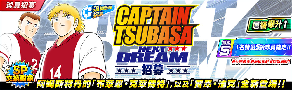 本次招募為層級攀升形式,在第3層級確定可獲得1名SSR球員,第5層級則可確定獲得1名精選 SSR球員!