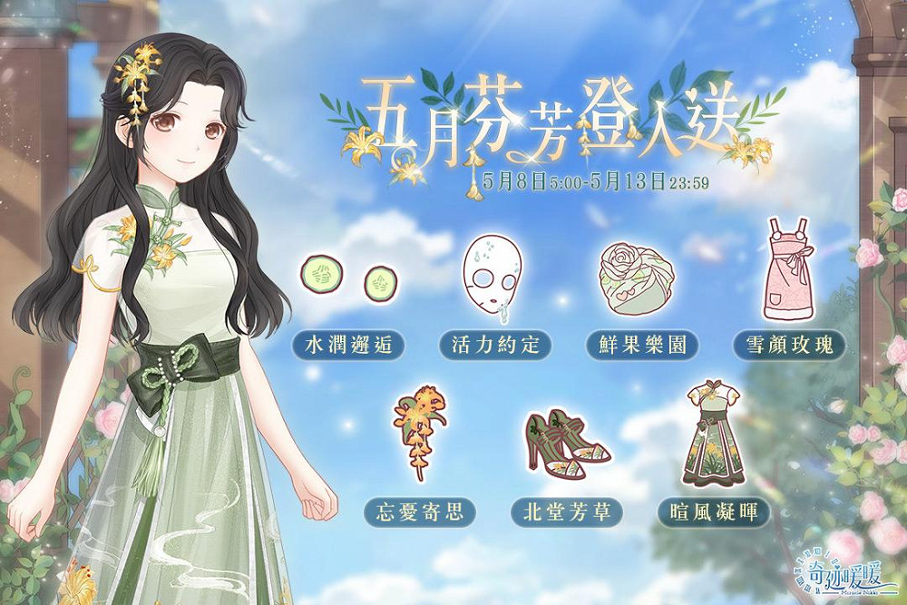 即日起至5月13日止,《奇迹暖暖》推出限時登入送活動,搭配師們只要在活動期間內登入遊戲,即可透過信箱信件領取散件「水潤邂逅」、「活力約定」、「鮮果樂園」、「雪顏玫瑰」、「忘憂寄思」、「北堂芳草」與「暄風凝暉」。