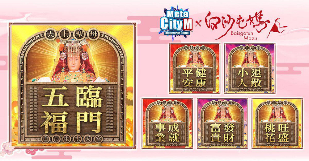由媽祖欽點將在《MetaCity M》元宇宙世界中,把真實世界宏偉莊嚴的廟宇建築平行植入,更攜手遊戲商Gamamobi共同發行3萬份「白沙屯媽祖加持信物福袋」(NFT盲盒),每個珍藏價99美元。以白沙屯媽祖聖像打造多款祈福祝禱設計的「白沙屯媽祖加持信物福袋」(NFT盲盒),預計5月將於《MetaCity M》官網上架販售,提供給廣大的信徒們認購。