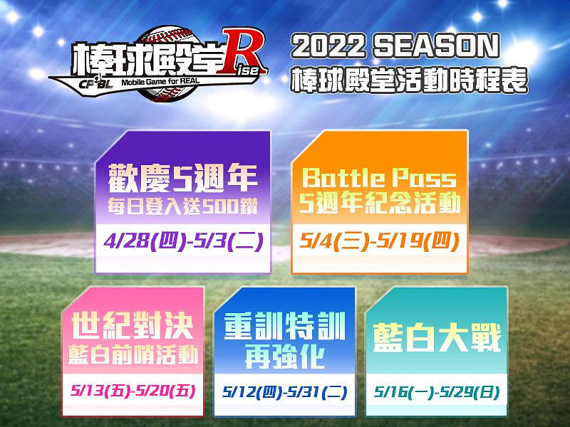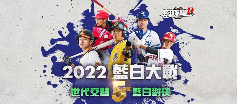 在歡慶5週年之際,《棒球殿堂Rise》邀請玩家和國家英雄隊一決高下!自5月16日起至29日止,遊戲內推出「2022藍白大戰」,透過生存模式,玩家將可選擇藍隊—「藍色英雄隊(國家明星隊)」,或是白隊—「白色王者隊(2022年度LIVE EX明星隊)」進行對戰,並在對戰中體驗今年度推出強度更甚以往的「LIVE EX卡」。