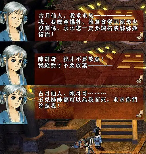 故事發生在隋朝末年,主角陳靖仇受師傅所托為復興故國踏上尋找上古十大神器的征程,途中結識了於小雪和拓跋玉兒,自此展開了一段令人動容緬懷的三人感情故事。至今仍記得,在鯨魚背上陳靖仇、小雪、玉兒三人許下永遠不分離的誓言,當《三個人的時光》BGM響起,三人執手相伴一路走來的點點滴滴躍然心頭,深厚的情誼從此在玩家心中深藏!