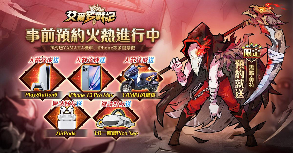 《艾爾多戰記》已開啟事前登錄活動,現在完成事前登錄,就能參與 iPhone 13 Pro Max、YAMAHA山葉機車、PS5、VR一體機Pico Neo等豪華抽獎活動。凡是參加了事前登錄活動的玩家,開局就能擁有2位SSR傳說英雄,提早組齊最強陣容對抗邪惡古神!更多遊戲資訊請關注《艾爾多戰記》官方粉絲專頁,超多有獎互動等你來贏,不要錯過喔!