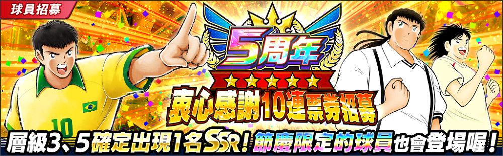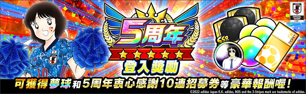 在「5周年活動第1彈」中,除了有穿著尤文圖斯正式比賽隊服的球員登場的「JUVENTUS選拔招募」,和「JUVENTUS OFFICIAL CAMPAIGN:全體玩家贈禮」外,還將實施最多500連免費的「5周年 : 衷心感謝 10連票券招募」、夢球50個和「選擇式SSR確定招募券」的「5周年 : 感恩好禮!」活動。