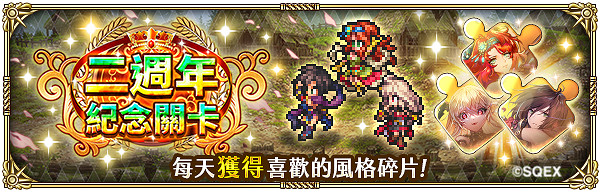 同步開跑的活動內容包含能讓玩家們快速培育角色與提升等級的期間限定「角色成長加倍活動」、「二週年紀念關卡」,與更容易提升技.術Rank的「修行者廳」等,並且在寶石商店中亦推出了適合新手的「新手塔士進階禮包」和期間限定優惠的「寶石特賣」。