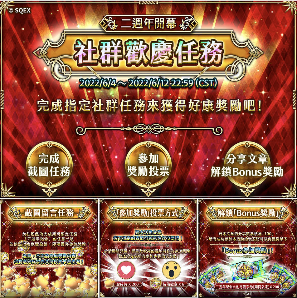 此外,只要於官方 Facebook 粉絲專頁成功參加「二週年開幕!社群歡慶任務開跑!」活動,即能獲得玩家票選出的參加獎勵──金碎片 x 200 或 裝備徽章 x 6。此外,如果達成指定目標還能得到額外的 Bonus 參加獎勵。