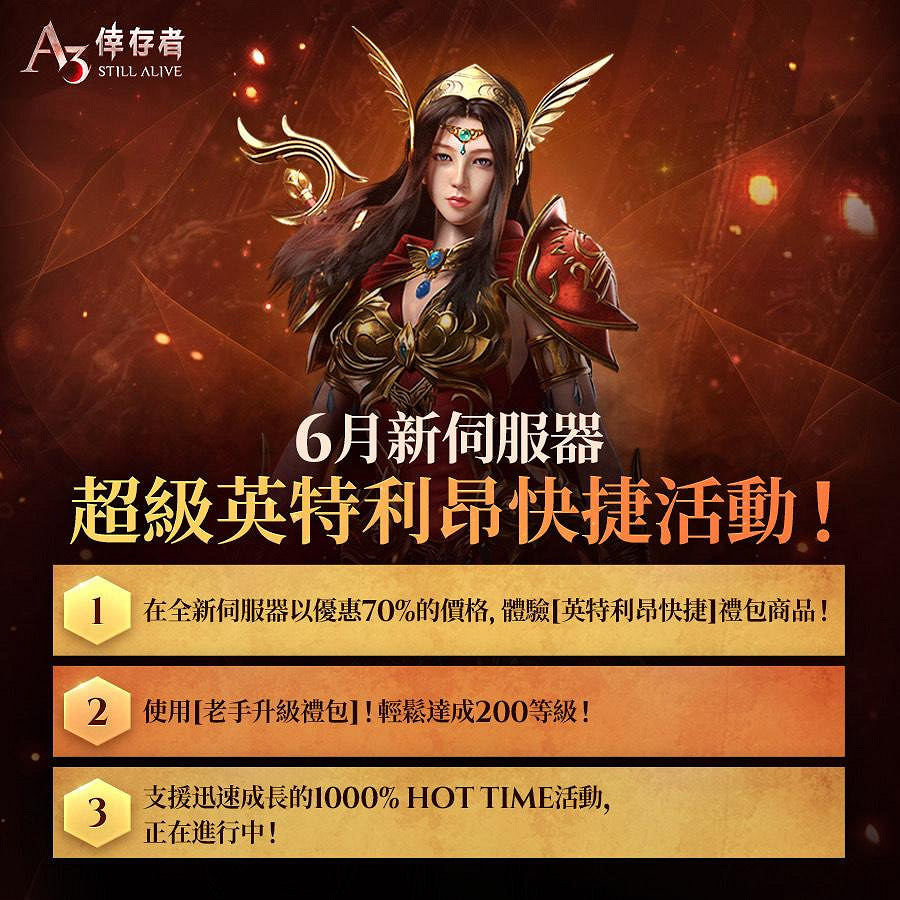 全新伺服器玩家Hot Time活動:玩家可獲取高達 1000% 的經驗值提升率(快速升級),以及在「英特利昂」副本中增加最高30%的機率(快速獲得礦石)。